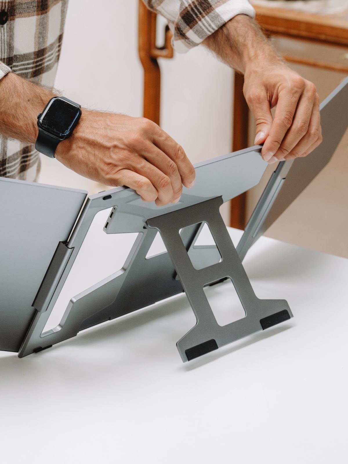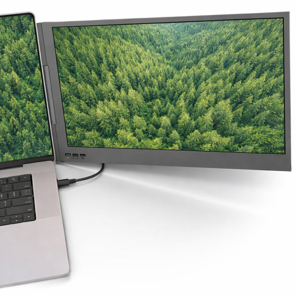 Introducing the Dual Boost Pro Max, the highest-quality dual-screen extender ever engineered. This device achieves its unrivaled slimness and feather-light profile through a sophisticated blend of premium aluminum and sleek composite materials. It delivers dual-screen clarity with two anti-glare monitors, all powered and connected via a single USB-C connection. It's the essential, flawless companion for elite mobile productivity.